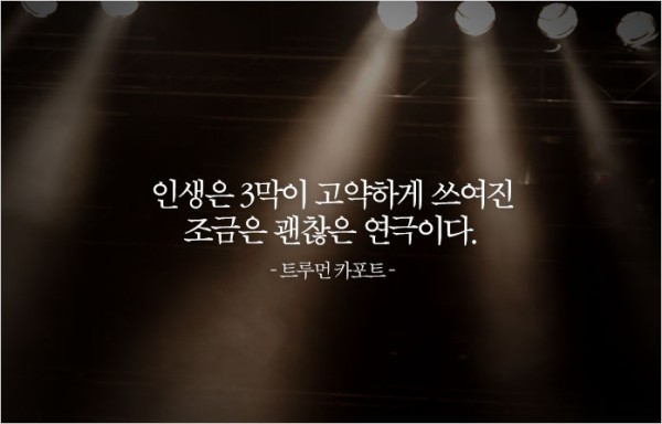 ‘티파니에서 아침을’로 유명한 트루먼 카포트. 영화각본가이자 소설가였던 그는 인생을 연극에 비유했습니다. 부모님의 보호막 아래 사회를 알아가는 20대까지는 인생의 1막, 사회에 나가 본격적인 어른의 삶을 살아가는 40대까지가 2막, 자식들을 출가시키고 제2의 인생을 살아가는 40대 이후의 시기를 3막이라고 할 수 있죠. 사회적인 지위가 달라지거나 급변하는 상황을 많이 접하는 인생 3막의 시기가 어쩌면 1, 2막보다 더 고달프고 힘들게 느껴질 수 있습니다. 그래도 연극이 흥미롭고 재미있기 위해선 적당한 갈등과 역경이 필요한 것 아닐까요? 우리의 인생도 조금 괜찮은 연극이 될 수 있도록 더욱 열정적으로, 더욱 즐겁게 인생 3막을 가꿔보세요!